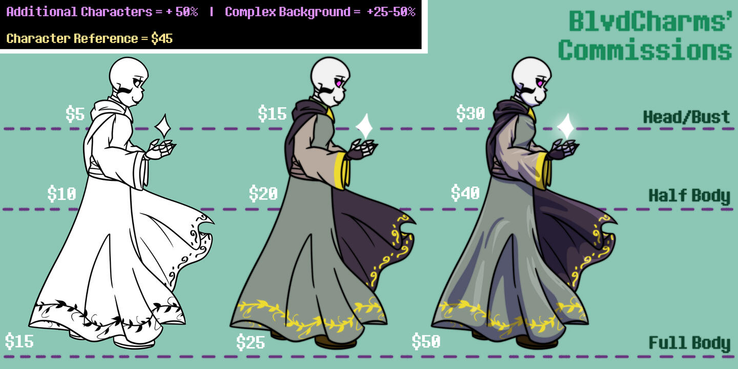 If the customer wishes to sell the commissioned art, they are required to mention these intentions before any transactions are made. Both parties can reach a compensation agreement to ensure the product may not require a large watermark.This does not apply to character references produced by BoulevardCharms. Such property has its ownership donated to the commissioner to use however they see fit. Limits apply via RULE 6 of BoulevardCharms' Art Commissions ToS.8. By purchasing a commission from BoulevardCharms, you AGREE to BoulevardCharms' Art Commissions ToS.